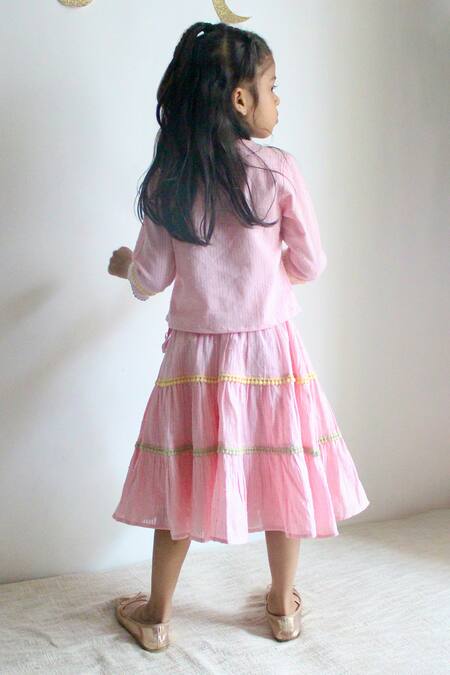 Pink Cotton Tassels, Lace Placement Work Top With Skirt
