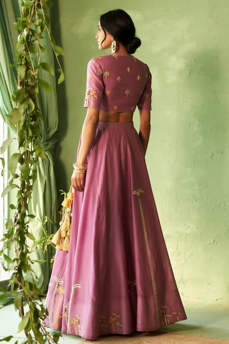 Purple lehenga set featuring a chanderi blouse and organza dupatta. The lehenga and blouse are embellished with machine and hand embroidery.