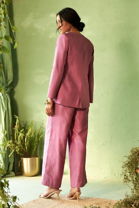 Purple chanderi top featuring machine and hand embroidery details. Paired with matching pant and jacket, both in chanderi fabric.