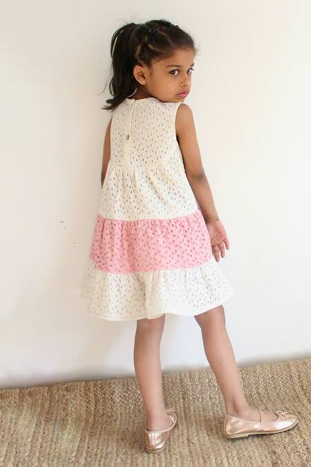 Schiffli embroidery throughout the dress, Contrast pink panel at the hem, Back button closure for easy wear