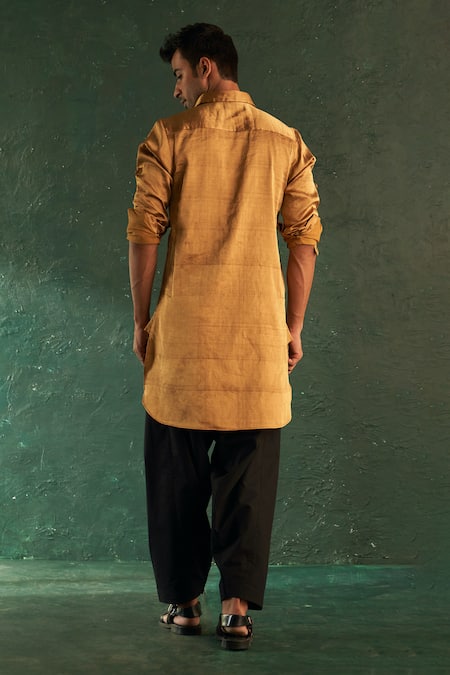 Gold silk tissue kurta featuring placed dori embroidery and a shirt collar. Paired with solid poplin salwar for a coordinated look.