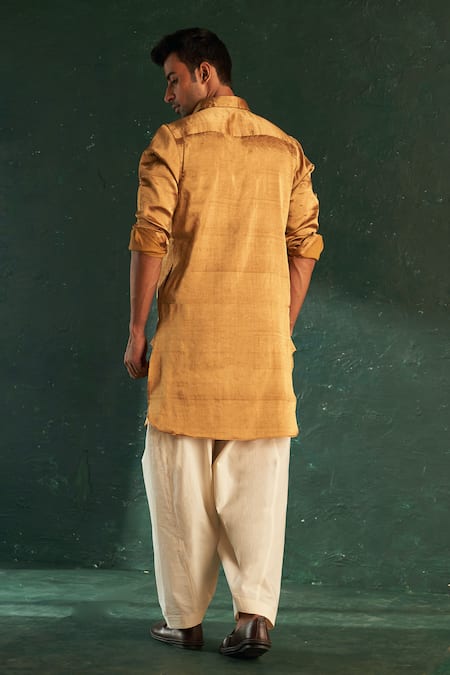 Rose pink silk tissue stripe patterned bundi featuring welt pockets. Paired with a metallic gold kurta and solid poplin salwar.
