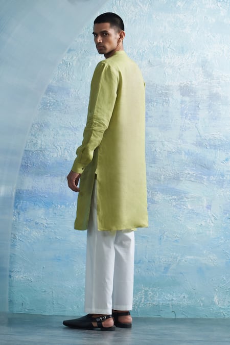 Solid green kurta featuring a mandarin collar and full sleeves. Paired with contrast salwar in cotton satin fabric.