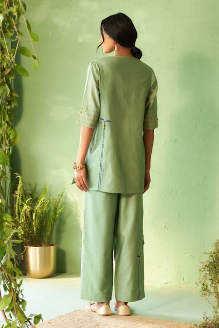 Tea green kurta featuring machine and hand embroidery with a round neckline and elbow-length sleeves. Paired with matching tea green pants made of chanderi and voil fabric.