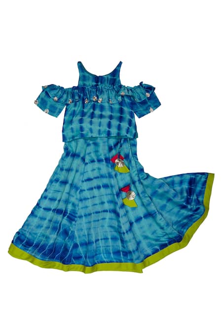 Blue lehenga featuring tie dye detail, side tassel tie-up & contrast border. Paired with a gota work, cold shoulder top with frill detail.