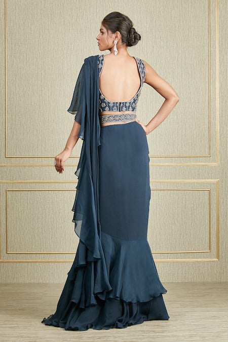 Blue Organza, Chiffon, Tussar V Neck Ruffle Saree Set