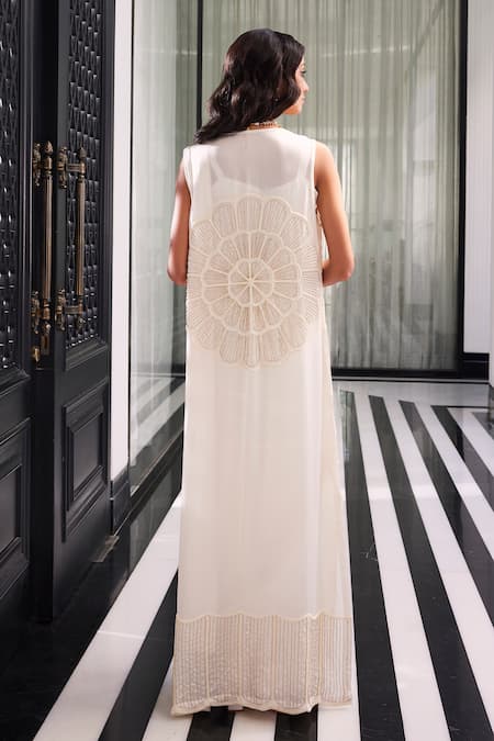 Ivory jacket with beads and cutdana embroidery in a striped pattern. Comes with pre-draped saree and bralette.