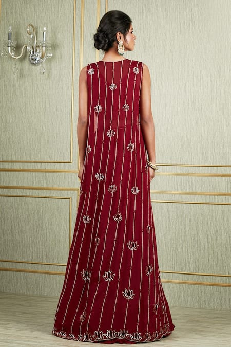 Oxblood front-open jacket with floral embroidered motifs. Paired with layered lehenga & overlap embroidered blouse.