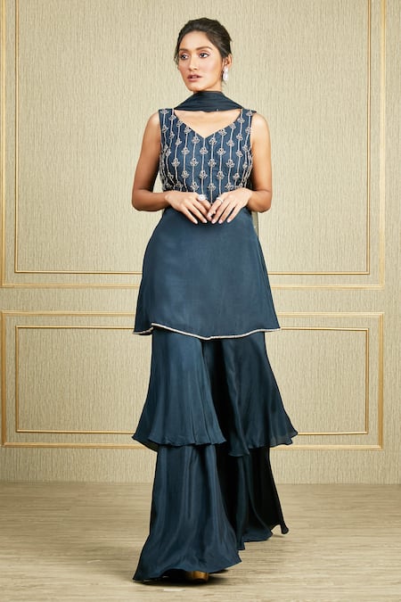 Teal blue kurta with floral embroidered bodice. Paired with layered sharara & net dupatta.