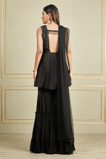 Black kurta with floral embroidered bodice. Paired with tiered sharara & net dupatta.