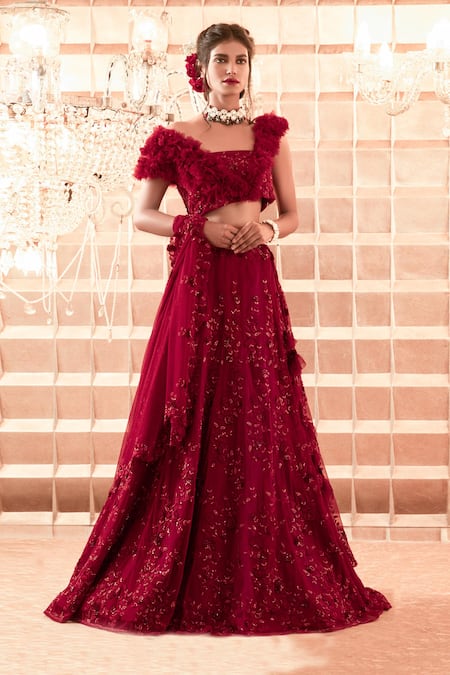Buy_Charu And Vasundhara_Maroon Blouse Net, Organza Lehenga Net Dupatta Hand Embroidered Bridal Set_at_Aza_Fashions
