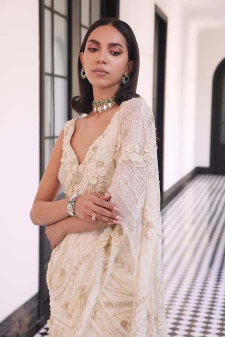 Ivory pre-draped lehenga saree with 3D bloom embroidery. Paired with a floral embroidered blouse.