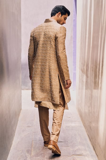 Beige long jacket with geometric motif hand embroidery. Comes with kurta & cigarette pant.