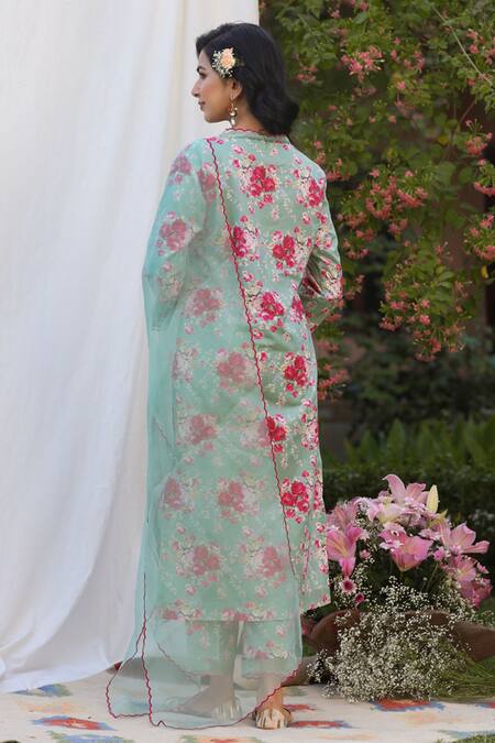 Green kurta featuring an all-over rose bouquet print and scallop trimmed neckline. Paired with coordinating floral print pant and dupatta.
