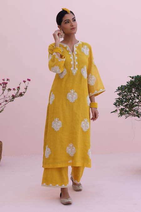 Mustard yellow straight kurta featuring intricate silver embroidery. Paired with coordinating pant and a dupatta in tissue chanderi fabric.