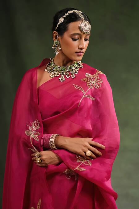 Wine saree featuring placement floral embroidery in sequin and thread work. Comes with an unstitched blouse piece in silk organza.