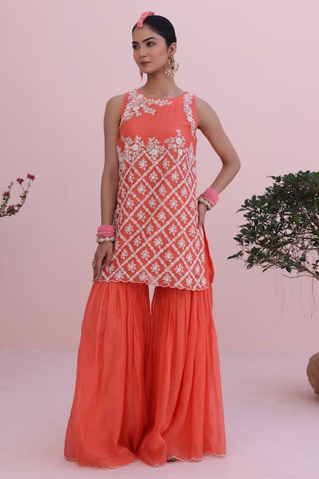 Coral kurta featuring intricate embroidery and a straight silhouette. Paired with matching sharara and a lightweight dupatta.