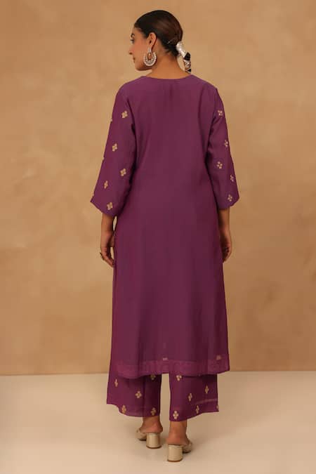 Purple kurta featuring a V-neckline and three-quarter sleeves. Paired with matching pants and a dupatta, all made from mul chanderi fabric.