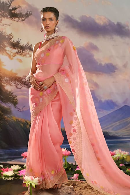 Peach silk tissue saree featuring floral and zari embroidery. Paired with a coordinating tissue chanderi blouse.
