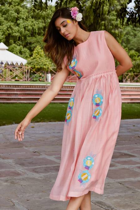 Peach sleeveless dress in chanderi cotton featuring multi-color floral patch detailing and pleated flare