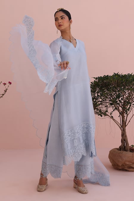 Moon blue kurta made from pure organza featuring embroidered patch details. Paired with cotton pants and a matching dupatta with embroidered accents.