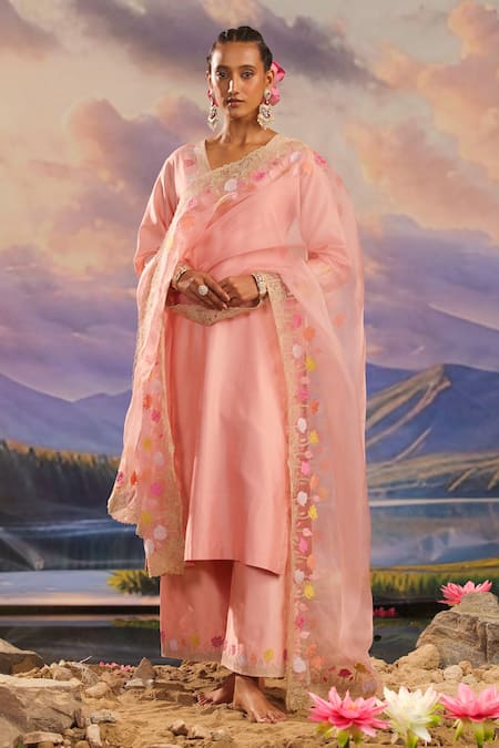 Peach Silk, Chanderi, Organza Embroidery, Zari V-neck Floral Kurta Pant Set