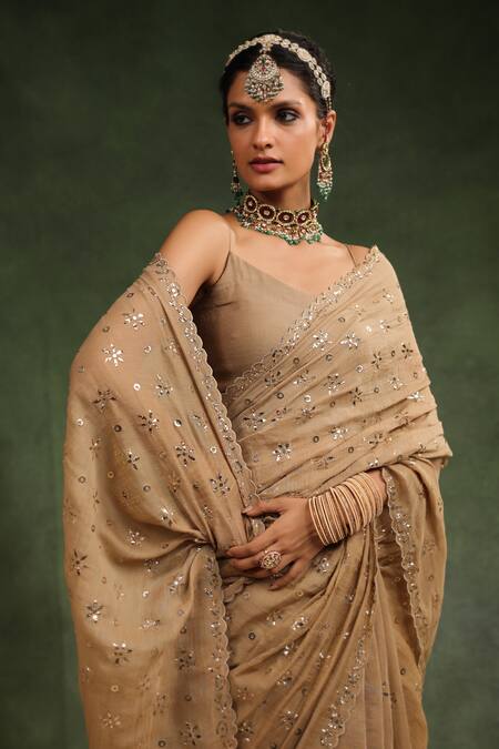 Beige saree featuring floral badla work throughout. Comes with an unstitched blouse piece.