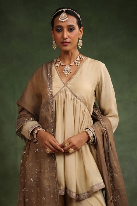 Beige gathered peplum kurta featuring a V-neck and full sleeves. Paired with a matching gharara and a scallop hem dupatta adorned with badla work.