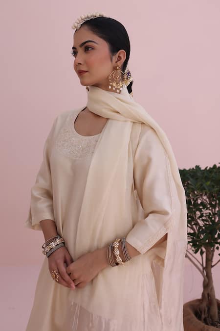 Pearl white silk chanderi kurta featuring intricate embroidery. Paired with a matching pant and dupatta, all made from silk chanderi fabric.