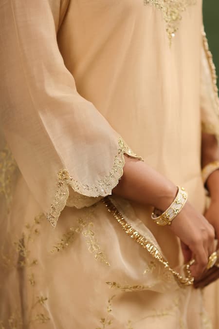 Beige Chanderi, Silk Organza Sequins, Embroidery, Romance Kurta Sharara Set