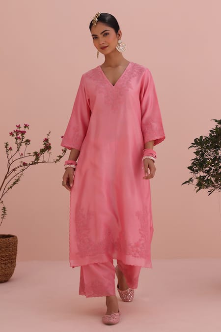 Pink Silk, Chanderi, Organza Embroidery V-neck Rose Kurta Set