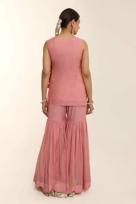 Rosepink kurta featuring embroidery details and a round neckline. Paired with a matching gharara and a sheer organza dupatta.