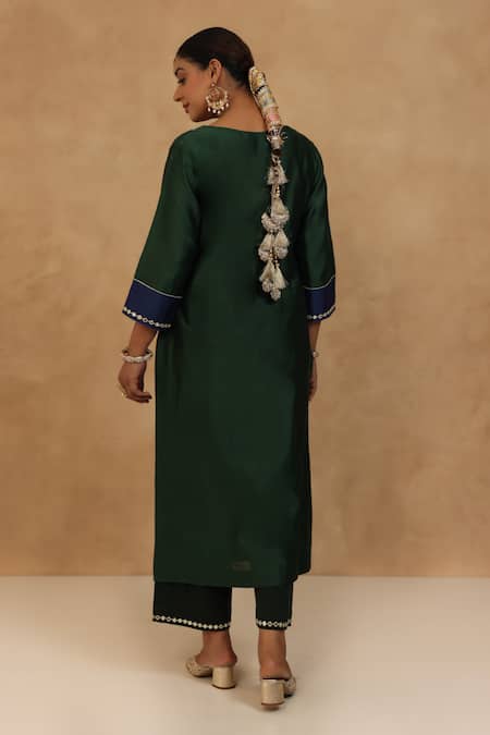 Royal green kurta featuring navy blue patchwork and intricate embroidery. Paired with matching cotton pants with silk chanderi patch.
