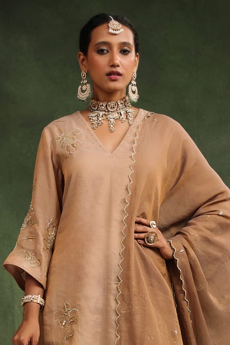 Peachish brown kurta featuring a V-neck, flared sleeves, and placement floral embroidery. Paired with a tiered gharara and scallop hem embroidered dupatta.