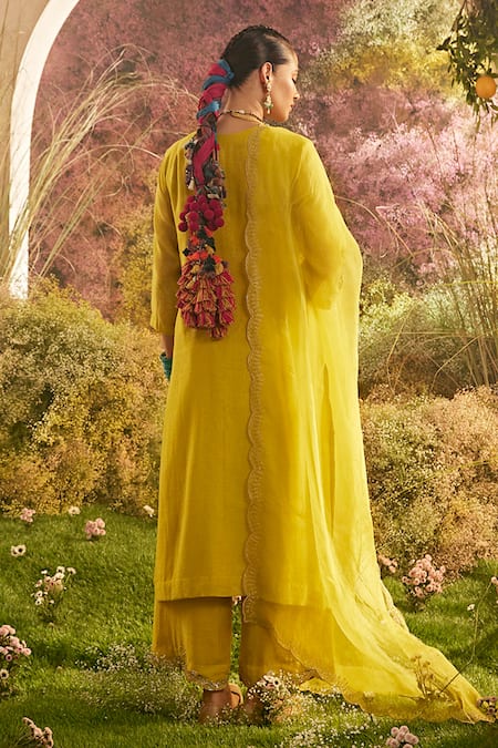 Yellow kurta featuring a notched V neck and three fourth sleeves with wildflora bloom butti embroidery. Paired with a flared palazzo and scallop border embroidered dupatta.