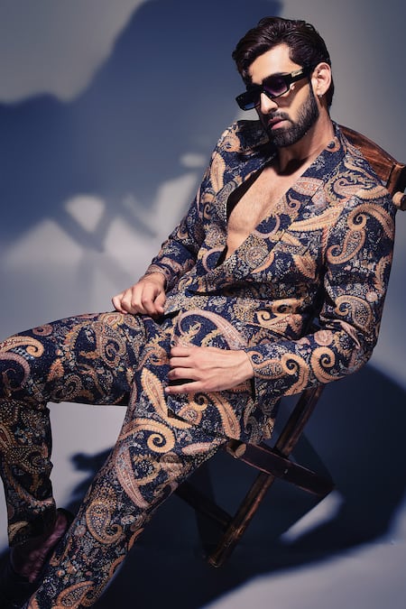 Buy_Chatenya Mittal_Multi Color Silk Paisley Pattern Tuxedo And Pant Set_at_Aza_Fashions