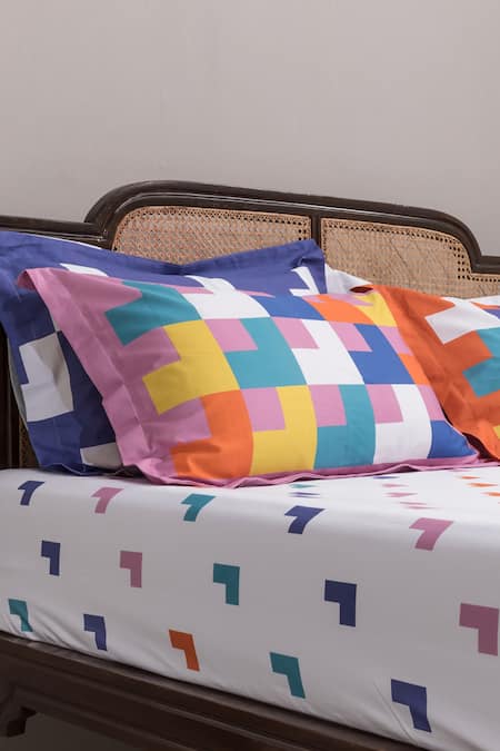 Buy_Kyoona_White 100% Cotton Print Chaukona Contrast Geometric Bedsheet Set_at_Aza_Fashions