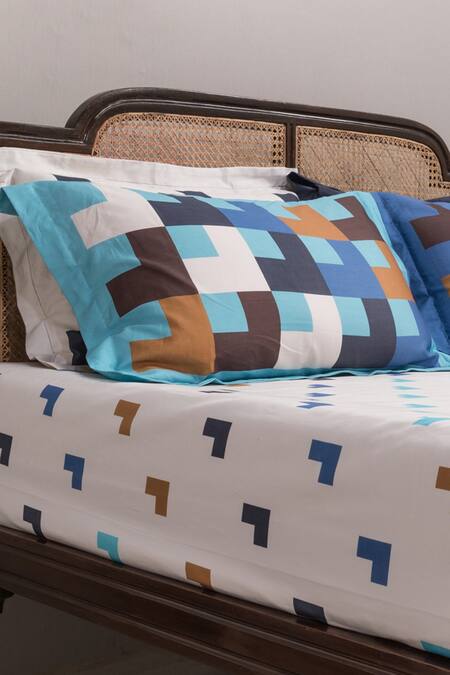 Cool white geometric print bedsheet. Comes along with 4 rectangle shaped, geometric print pillow cases.