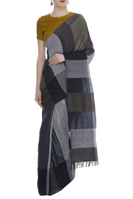 This beautiful amalgamation of traditions with this handwoven grey cotton silk saree featuring checks pattern all over.