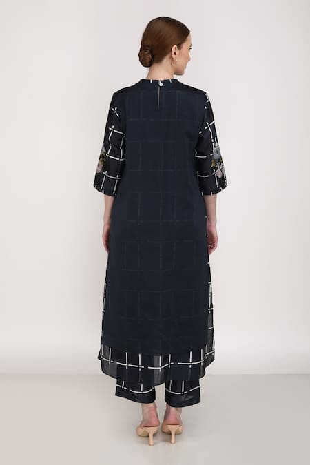 Indigo kurta with checkered & floral pattern. Paired with pant.