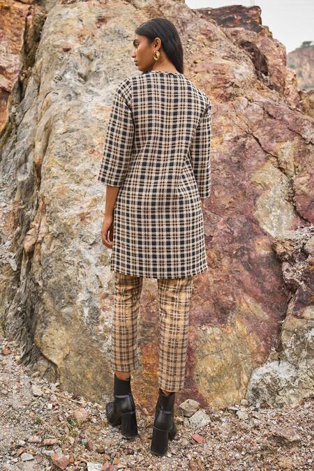 Black, gold top with checkered pattern & round neckline. Paired with pant.