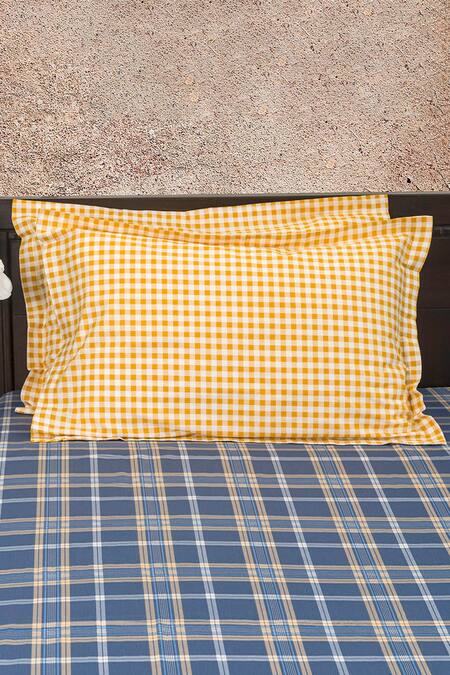 Blue bedsheet with yellow, white checkered print. Comes with checkered print two pillow covers.