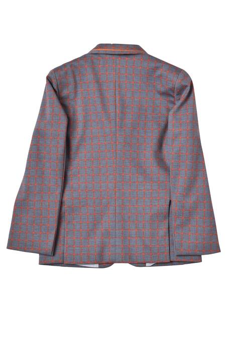Blue checkered coat with flap pockets and orange sash. Paired with a white shirt and pants, featuring full sleeves and a shawl collar.