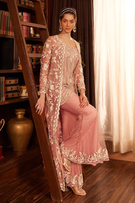 Ivory and pink scallop edged jacket featuring floral resham, pearls, crystals, and thread work embroidery. Paired with a coordinating short kurta and sharara.