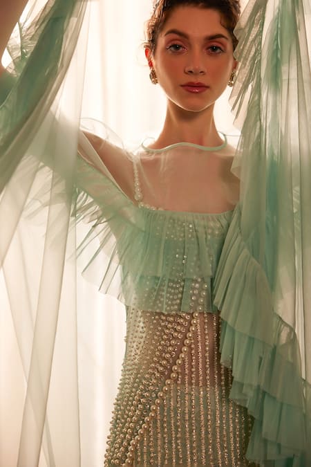 Tiered ruffle detailing on the cape, Pearl and crystal embellishments on tunic, Intricate thread embroidery patterns
