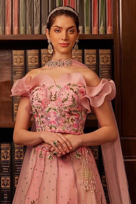 Pink lehenga featuring scallop hem with sequins, thread work and beads embroidered floral motifs. Paired with a coordinating ruffle embroidered blouse and crystal accents embroidered dupatta.