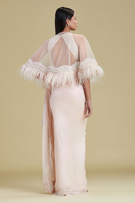 Embroidery >Scallop border on saree >Embroidered sequin & pearl motifs on blouse >Back cutout detail on blouse >Embroidered sequin & pearl motifs on cape border >Scallop hem on cape >Fringe detail on cape hemClosure: >Blouse: Concealed back hook placket >Cape: Tassel tie-up on neckline