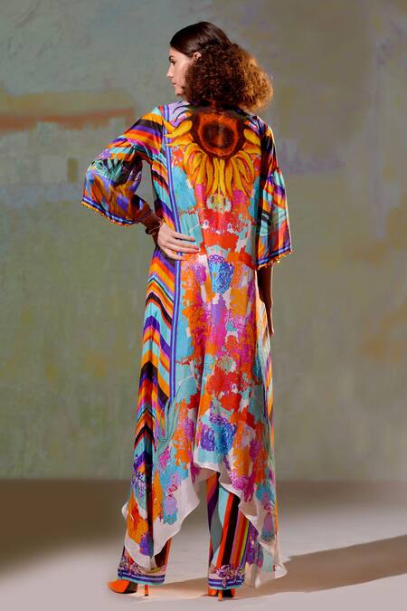 Multi Color Silk, Satin Abstract, Floral, Chetna Flared Tunic And Pant Set