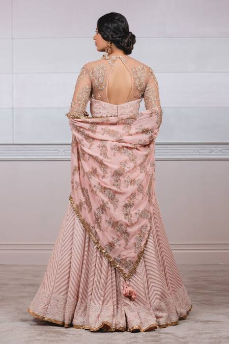 Old rose chiffon chevron chikankari lehenga highlighted with kasab work. Paired with a chikankari & lace blouse highlighted with crystals & a triangular georgette dupatta with lace inserts.