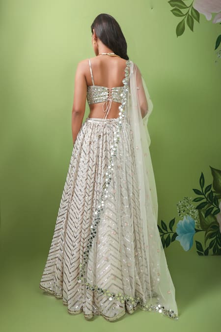 Ivory,off white georgette lehenga with attached cancan and chevron embroidery in sequins, mirror and patra. Comes with embellished padded blouse & floral bordered dupatta.